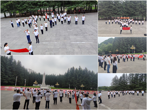在杨靖宇将军纪念碑前,全体党员以五角星阵型列队,高举右拳,面向党旗,重温入党誓词。